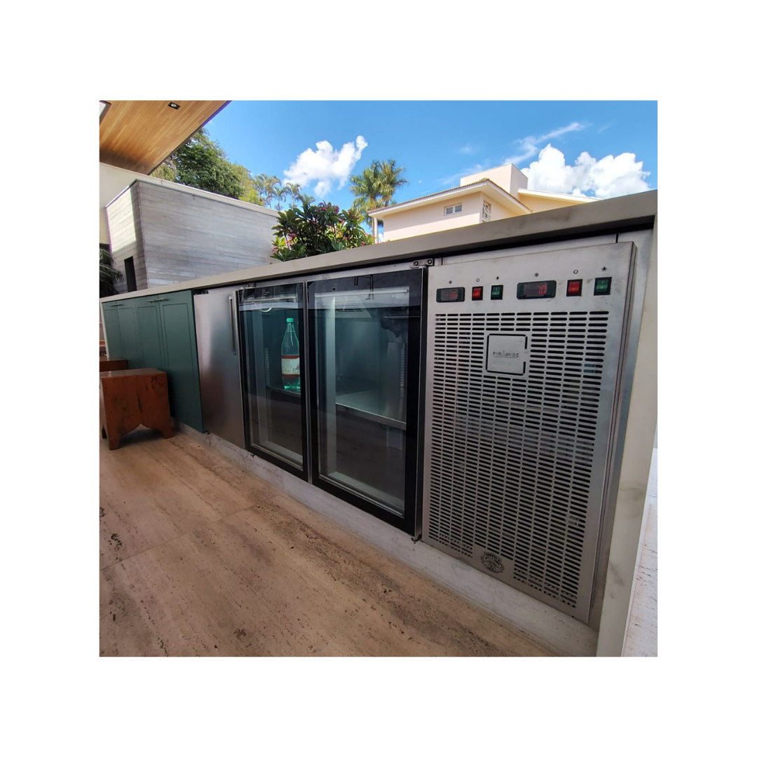 Refrigerador embutido sob medida, com acabamento em aço inox e portas de vidro temperado. Funcionalidade, sofisticação e alto desempenho para cozinhas contemporâneas.