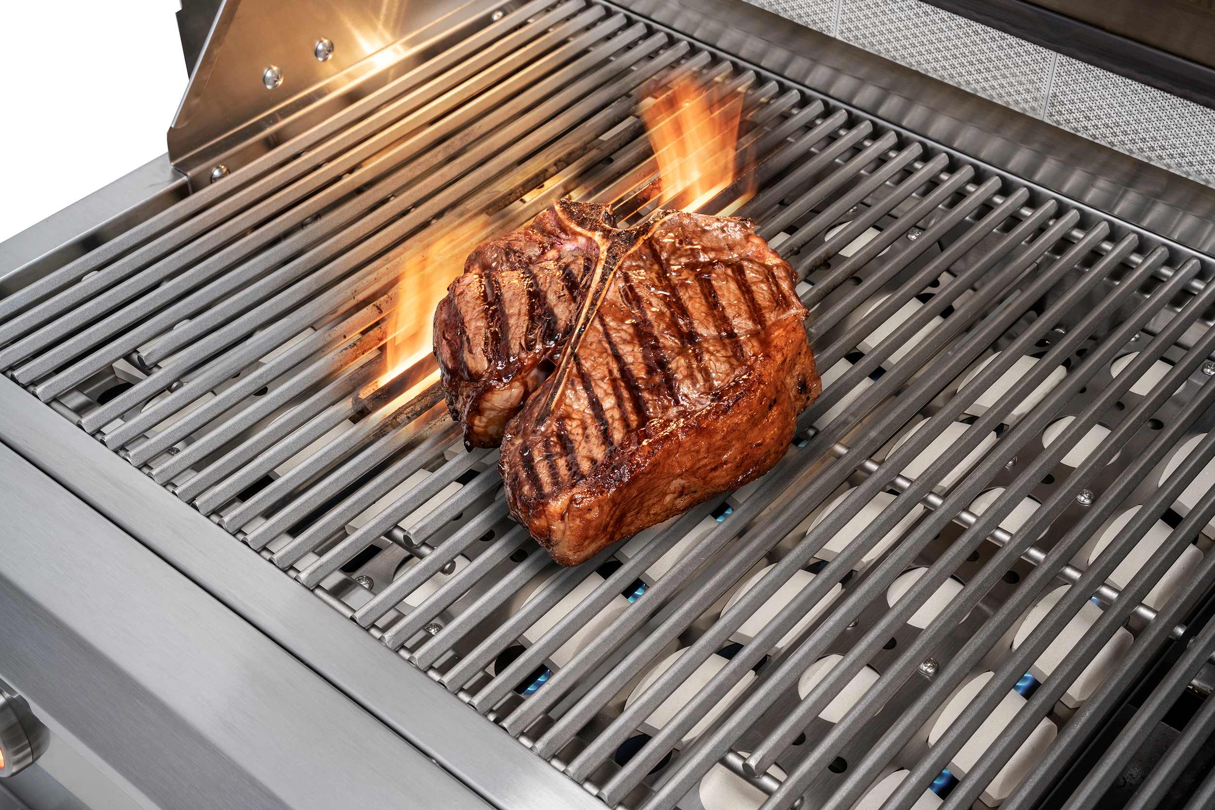 A TBBQ100A prepara com rapidez grandes refeições por oferecer exclusivas grelhas piramidais em inox de 8 mm com melhor distribuição de calor e potentes queimadores em inox fundido e um selador Sear, todos com potência de 15.000 BTUs.