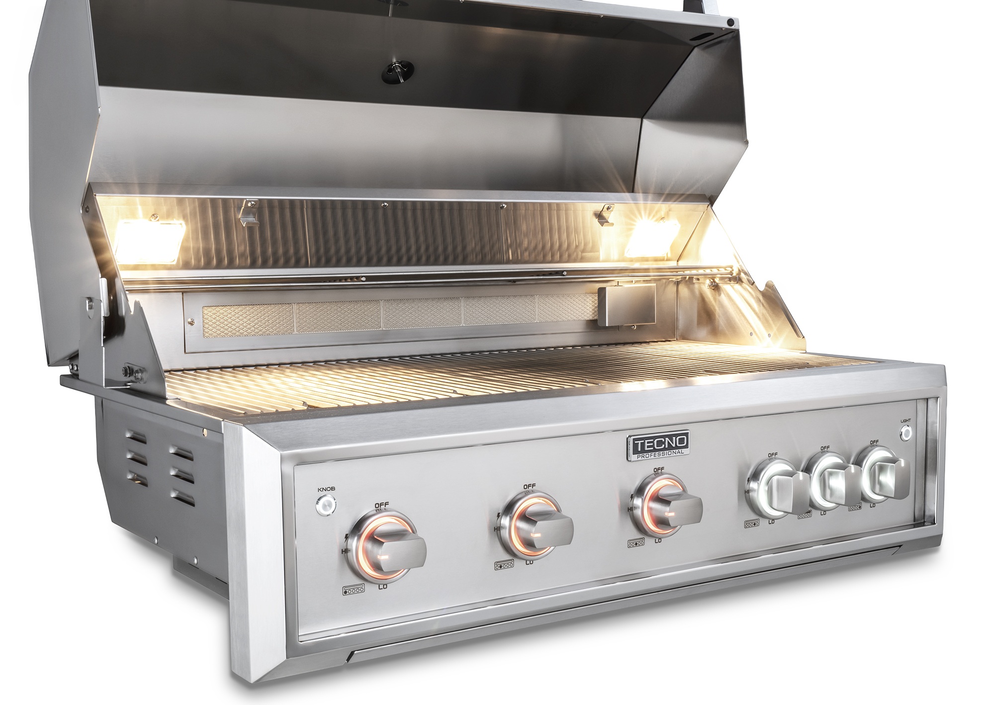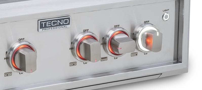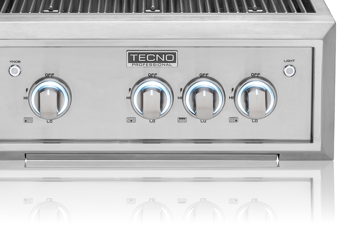 Um painel de refinado design com bordas angulares exclusivo Tecno se integra com mais elegância aos espaços gourmet por trazer a bandeja coletora integrada em sua parte inferior e manípulos iluminados em LED de 2 cores.