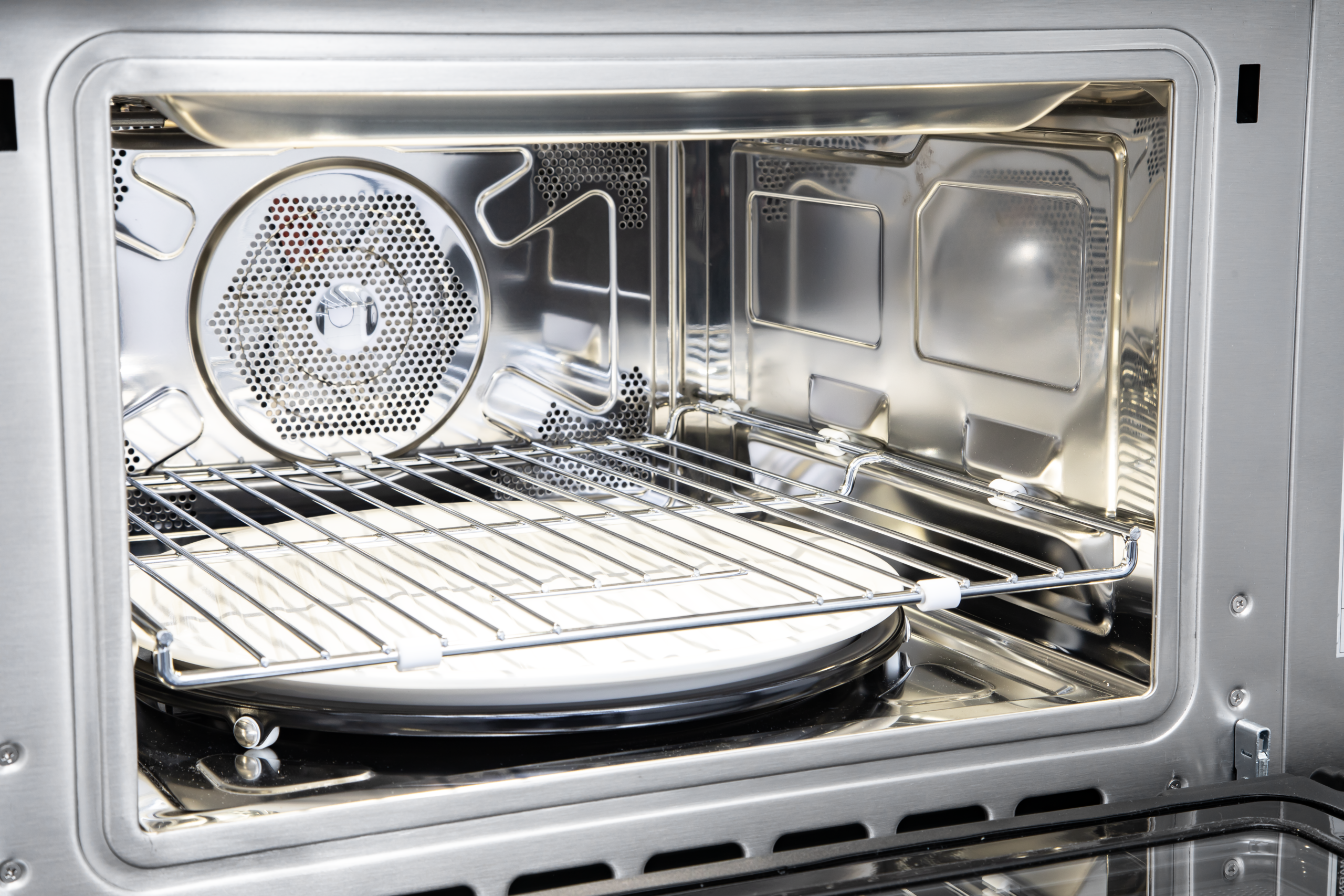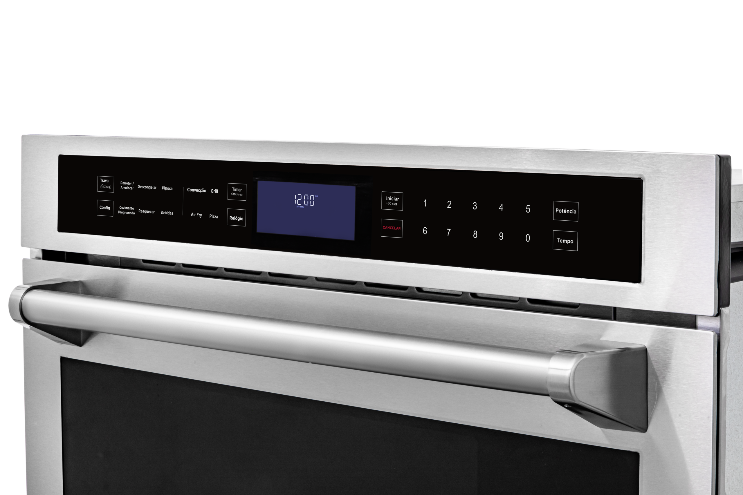 No desempenho, une micro-ondas e forno em um único corpo, com comando touch, funções como Air Fry e Grill, além de programas pré-definidos para preparos como pipoca e pizza. Também permite combinações, como Grill com Micro-ondas, acelerando o tempo de preparo e garantindo finalização mais uniforme.
