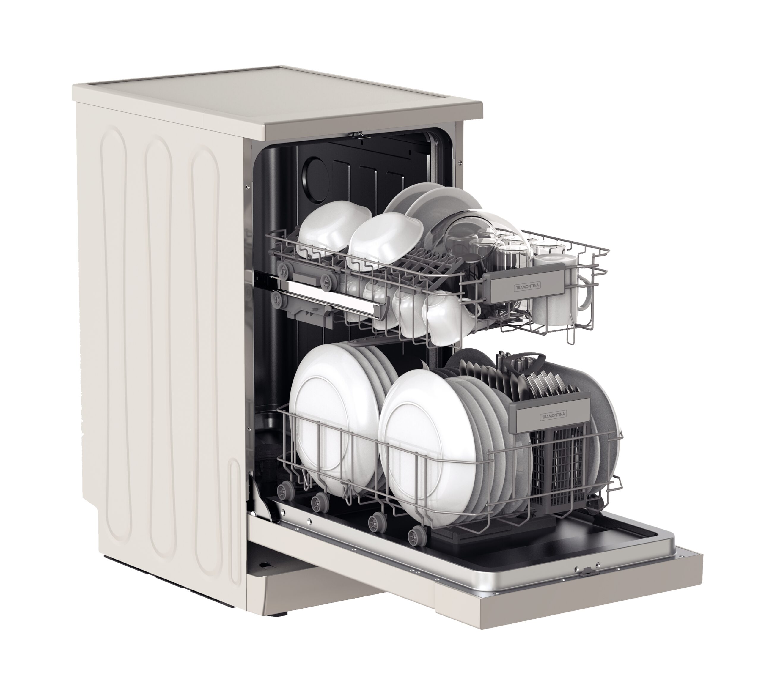 Cesto superior com sistema de regulagem de altura (conforme o tamanho da louça) Cestos com suportes internos dobráveis para ampliar o espaço interno. Filtro de sujeira de fácil remoção para limpeza.